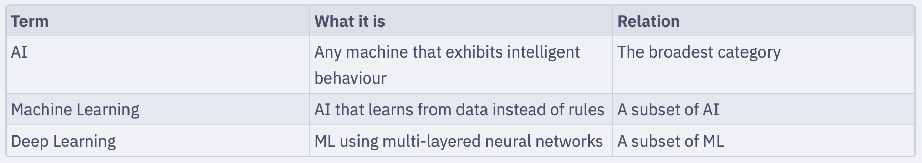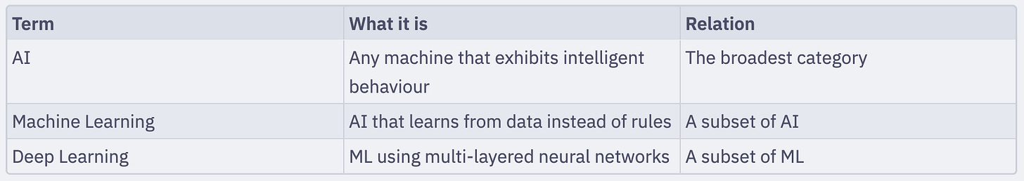 Artificial intelligence (AI) is the broadest term. It refers to any system that exhibits intelligent behavior — reasoning, problem-solving, learning, or decision-making — that we’d normally associate with humans.