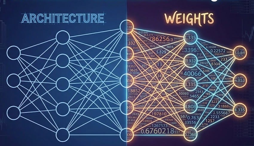 Think of it like this: the architecture is the recipe structure. The weights (learned parameters) are the specific measurements tuned by tasting thousands of dishes.